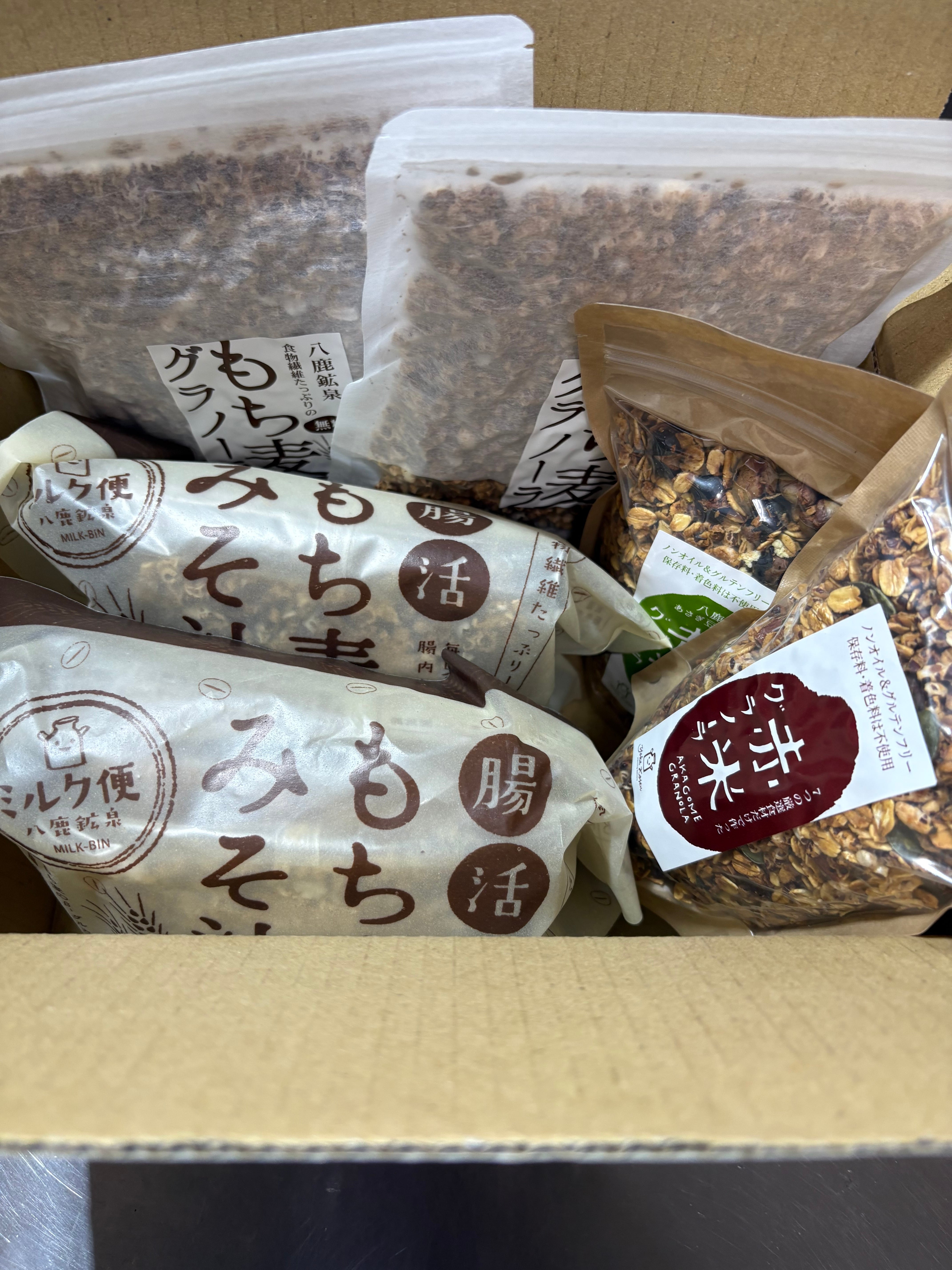 セット内容:赤米&あさぎ豆グラノーラ各1、もち麦みそ汁2個、もち麦グラノーラ2個